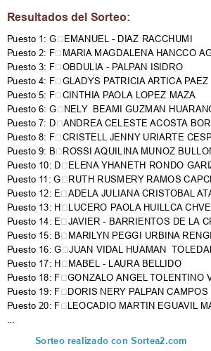 Lista de participantes: A ANGEL ANTONIO RAMOS CHACON, A CARMEN LIDIA MITMA FERNANDEZ, A CIRILO - TOLEDO ZARATE, A DENNIS FLOR CABRERA HUAMAN, A DIANA CAROLINA RODRIGUEZ VERA, A ELENA NOEMI RIVERA HUAMAN, A ELSA - POZO SANCHEZ, A EVELIN - PUYO PUA, A FLOR DE MARIA DAVILA MEZA, A FRANCY ESTEFANY CRISANTO ROSAS, A GABRIELA - GRANDEZ FRIAS, A GABRIELA DEL PILAR HERRERA PAREDES, A GLORIA - SULCA TINEO, A GUILDA CLARA SOPLIN DE RODRIGUEZ, A JHINO ANROBERTH SALINAS LANDA, A JHON ROY TELLO QUISPE, A JOSE ALEXANDER OLAECHEA GARCIA, A JUAN FELIX VILCHEZ CHAVEZ, A JUANA ROSA COLLACHAGUA TAYPE, A KANTY GIOVANNA APOLINARIO MUÑOZ, A LESLY MAYLI TRUJILLANO APARICIO, A LUANA DAYSI ZAGACETA MEGO, A MAGALY LORENZA INGA CORREA, A MANUEL ENRIQUE ROMERO ANGELES, A MARIA ELENA POMA HERMITAÑO, A MARIA ELENA VEGA ZAMORA, A MARISSA FIANY SENADOR VEGA, A MARTHA - ODAR TORRES, A NELINDA - TORRES FLORES, A NINA HAYDEE VALVERDE BAUTISTA, A RAISA GUILIANA FRANCO LESCANO, A RITA BERTHA VASQUEZ DE CUELLAR, A ROSA LUZMILA BALDEON CONDORI, A ROSA MARIA MEZA HIJAR VDA DE BERNA, A YALERY - GAMARRA SIMON, A YDEL MAGDALENA LLONTOP VILCHEZ, B AGUSTINA - HUIMAN MEDINA, B ALESSANDRO DEL PIERO CORPUS QUISPE, B ANDREA - CABRERA IBANEZ, B AQUILES TEOFILO FIGUEROA SANTISTEBAN, B AUREA ALBINA CARRASCO SILVA, B BASILIA - TORRES OJEDA, B BAYXZA - CAÑOTE AMAYA, B CLAUDIA - CABRERA IBANEZ, B DEYSI XENIA HUAMAN LAZO, B EDILTER JOSUE PACAYA SILVA, B ELA PILAR BASURTO DE PONCE, B ESTEFANIA BEZZUBIKOOFF FLORES RAMOS, B ESTHER INOCENTA BRINGAS CAMPOS, B FLAVIO JESUS SALAS DIAZ, B GABY JANET PALACIN EUFRACIO, B INGRID MILAGROS CAYETANO SILVA, B JACKELINE LUZ YUPANQUI FELIX, B JOHN CHRISTIAN HUAMAN FERNANDEZ, B JORGE ANDRES ZUAZO RIVERA, B JOSUE WALDIR ROMERO LARREA, B JUAN JOSE VILCATOMA OBREGON, B JUANA - QUISPE CORONADO, B KLEBER ALESSANDRI ACEDO ALVARADO, B LILIAN VARGAS CANDIOTE, B LUIS ALBERTO SOTO LOZANO, B LUSMILA CERAFINA OLIVARES JUSTO, B LUZ - AGUIRRE OREJON, B MARCO JESUS HUAMAN AYAMBO, B MARIA MAXIMINA LA MADRID ARRINCON, B MARICELA ROSARIO VILLA GARCIA, B MARILYN PEGGI URBINA RENGIFO, B MELANNY GLORIA CARDENAS RAMOS, B MERCEDES - QUIROZ CASAS, B MERCEDES - SOVIA HUALLPA, B NAMI TIANA GRISEL GABANCHO VERGARAY, B NELLY ENCARNACION ARAUJO CORILLA, B NELSA PILAR CHAGUA RIVERA, B PATRICIA VERONICA CALLE BARATA, B PEDRO ARMANDO TORRES ESPINO, B ROSSI AQUILINA MUNOZ BULLON, B VIRGINIA ROSAURA HUALPA QUISPE, B YACIYDERLINE NO FERMIN SIERRA, B YOLANDA IRENE CAMACHO CHUMPITAZ DE ABURT, B YSAAC GABINO PAREJA VILLAGARAY, B ZAIRA JAZMIN PALACIN RODRIGUEZ, C ADRIANA XIOMARA LARREA MELENDEZ, C AMANDA - BOZA CARBAJAL, C ANDRS IGNACIO SALAS LEAL, C BENAZHIR - PUCHOC CARDENAS, C BERTHA VIOLETA PISFIL RELUZ, C BEVERLY ALEJANDRA GUTIRREZ MONTEZUMA, C CARMEN SILVIA HUAYNATES HUAMN, C CLEIDE - FLORES SAAVEDRA, C CLORINDA ISABEL TADEO SAAVEDRA, C COQUI NILTON ALDANA LAUREANO, C ELIANA DEL VALLE PIRELA MALAVE, C GESLER - RAMOS TACUCHE, C GISELLA IVONNE BARRETO OTOYA, C HERLINDA - SUAREZ CHASQUERO, C HERNAN ROEMER ESPINOZA CHAMORRO, C JONIQUER - HUANSI YNUMA, C JORDAN STEVEN TORRES VASQUEZ, C MARCELINA - CRUZ JARA, C MARCELINO - TORRES ALMARRACIN, C MARIA VICTORIA QUINTANILLA DE LA CRUZ JIMENEZ, C MARIELA - MORENO QUEZADA, C MAXIMILIANA - PRADA REINOSO, C MICHEL VIDAL SANTOS ROMAN, C MIGUEL ALBERTO BASTERES SOTO, C NANCY - OSCCO OSCCO, C NOELIA - ESPINOZA ALANIA, C POMPEYA YSABEL MARTINEZ HUARCAYA, C RAQUEL - SAMANIEGO GUERRA, C ROBERNG RAFAEL GONZALEZ MEDINA, C ROCIO MAGALI ROMERO AYLAS, C SILVANA MIRELLA COLQUICHAGUA PAULINO, C SONIA SOLEDAD ROJAS OSORES, C URBINA ALICIA LOPEZ INGAROCA, C WENDY ANAIS DE LA FLOR LAUREANO, C YENNY ISABEL CAMPOS LOZANO, C YOHANA MARCIA SANCHEZ GUERRERO, D ANA MARIA BERROCAL ZAMORA, D ANDREA CELESTE ACOSTA BORJAS, D ARACELI MARCELINA ILLACONZA FLORES, D ARMILDA - CORDOVA IPARRAGUIRRE, D AULERIA - LOYOLA LIBERATO, D CARMEN - MARIÑO SEDANO, D CARMEN ROSA YARMA AGUIRRE, D CAROLINA - GARCIA GALARZA, D CIRA LILA ALARCON SALAS, D CRISTINA - CORONADO MARTINEZ, D DARIA CRISANTA CCANCCE ARROYO, D DELICIA ALIDA ARIAS DIAZ, D DENIS ESTELA HUATA CONDOR, D DEYNNY KELLY GOMEZ PEREZ, D DORIS SILVIA TITO PONCE, D EDDY MARISOL TRUJILLO POSADAS, D ELENA YHANETH RONDO GARIZA, D ELITA LUISA VELASQUEZ SANTILLAN, D ELIZABETH - RAMOS BARRETON, D ELVA LEALI AMIAS CAYETANO, D ESTHER - BUSTAMANTE NAVARRO, D EVELYN ROXANA VALERA VELASQUEZ, D FELICITAS - YANE CRUZ, D GABRIELA JACKELINE ROJAS BERNAL, D GISELA - LLATA PACHECO, D GLORIA - QUISPE ROJAS, D GRECIA ESTRELLA CABUDIBO ACHO, D GUADALUPE ALEJANDRINA SANCHEZ RODRIGUEZ DE FLORE, D HOLINDA - SIQUIHUA JIPA, D ITALO AARON CASTILLO PAREDES, D JANETH - GONZALES CARRANZA, D JEANETTE NANCY HUAMAN ORE, D JESUS DIEGO MALMA PACAHUALA, D JHONATAN EULISES DIAZ ALVITEZ, D JHOY JIOVANI PACAYA TUANAMA, D JORGE LUIS ATENCIO CISNERO, D JOSE DANIEL CUEVA QUISPE, D JUANA ESTHER HUARACA CARLOS, D JUANA - PALOMINO ZAVALA, D KAREN MAGALY GALA MARCELO, D KARINA - INGA LIMAYMANTA, D KARINA MILAGROS PAUCAR DAVID, D KATHERINE JAZMIN QUISPE MITMA, D LEDY DEL SOLAR MORALES BARCO, D LIDIA CORINA ANGELES REGALADO, D LIZ EDILBERTA ABURTO SILVA, D LIZETH DANIZA TORRES ALANIA, D LLESIVEL - RENGIFO MARICHIN, D LUCIVET DOMINGA RAMOS CONTRERAS, D LUZ MARIANA CAMACHO SEIJAS, D MANUEL GERARDO CHIRINOS HARO, D MARGOT - ROJAS RODRIGUEZ, D MARIA VICTORIA CORTEZ DE PERALTA, D MARIA MILAGROS FERNANDEZ MARTINEZ, D MARIA DE LOS ANGELES HUAMANI CHUMPITAZ, D MARIA ELENA MEDRANO LAZON, D MARIA GLADYS MURAYARI PEREZ, D MARIA LUZMILA PAREDES SILVANO, D MARIBEL - EUSEBIO POMAHUACRE, D MARILYN YESSENIA RAMIREZ SANCHEZ, D MARLEN LUCERO MARCOS CANCHIHUAMAN, D MERALDA YSABEL MARTINEZ RODRIGUEZ, D MILTON JHON PORRAS CARHUACHAGUA, D MIRTHA JANETH MADRID SANDOVAL, D MISHEL SORAYNE ORDONES YANQUI, D MONICA CECILIA ANTON CRESPO, D NELLA FRANCISCA HUAMAN NUÑEZ, D NILA MARIBEL HUMALA CHIPANA DE JAVIER, D NORKA - PAMPAS LEON, D OFELIA - HERRERA CHAVEZ, D OSCAR - VERA DUENAS, D ROCIO DEL PILAR VERASTEGUI RICRA, D ROSELYS DEL CARMEN GUTIERREZ VILLALTA, D 