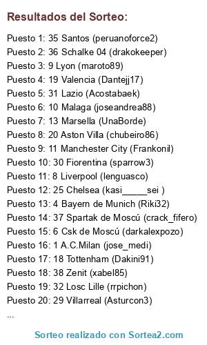 Lista de participantes: 1 A.C.Milan (jose_medi), 2 Anzhi (Arkhan99), 3 Arsenal (javiii_11), 4 Bayern de Munich (Riki32), 5 Benfica (escarabajos), 6 Csk de Moscú (darkalexpozo), 7 Inter de Milan (Fumeta06), 8 Liverpool (lenguasco), 9 Lyon (maroto89), 10 Malaga (joseandrea88), 11 Manchester City (Frankonil), 12 Manchester United (Duendes), 13 Marsella (UnaBorde), 14 Oporto (sefemu79), 15 Real Madrid (JF_SAL), 16 Roma (Huevon27), 17 Sevilla (kuky91), 18 Tottenham (Dakini91), 19 Valencia (Dantejj17), 20 Aston Villa (chubeiro86), 21 At.Madrid (Kerulo), 22 At.Bilbao(OILSTENEER), 23 Bayern Leverkusen (nn_gonrev), 24 Borussia Dortmund (elreyelfo), 25 Chelsea (kasi_____sei ), 26 Everton (jujumirah), 27 Juventus (rubenmartin10), 28 F.C. Barcelona (pirichi_N1_), 29 Villarreal (Asturcon3), 30 Fiorentina (sparrow3), 31 Lazio (Acostabaek), 32 Losc Lille (rrpichon), 33 Napoles (gusacedeira), 34 PSG (Pedrinho10), 35 Santos (peruanoforce2), 36 Schalke 04 (drakokeeper), 37 Spartak de Moscú (crack_fifero), 38 Zenit (xabel85).