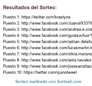 Lista de participantes: https://twitter.com/sweelye, https://twitter.com/BeatrizMPP, https://twitter.com/paulasifora, https://twitter.com/rosanamontes, https://twitter.com/AngelitoRubio29, https://twitter.com/Annyanka, https://twitter.com/isabelapalarj, https://twitter.com/krastyna, https://twitter.com/quinotweet, http://www.facebook.com/maria.ruizol?fref=pb, http://www.facebook.com/gustavofuor?fref=pb, http://www.facebook.com/crisgarciacolorado?fref=pb, http://www.facebook.com/ignacio.merino.58?fref=pb, http://www.facebook.com/domingolopezoller?fref=pb, http://www.facebook.com/cristina.caro.311?fref=pb, http://www.facebook.com/rogelio.g.lopez.12?fref=pb, http://www.facebook.com/carlospuechabm.susana?fref=pb, http://www.facebook.com/mariadelmarfernandezdealba?fref=pb, http://www.facebook.com/roberto.lindez?fref=pb, http://www.facebook.com/jose.pascualzakon?fref=pb, http://www.facebook.com/carmela.alcaldemoreno?fref=pb, http://www.facebook.com/zda.ls?fref=pb, http://www.facebook.com/juanfrandalias?fref=pb, http://www.facebook.com/vale.martinmartinez?fref=pb, http://www.facebook.com/javidelao?fref=pb, http://www.facebook.com/s.villarzafra?fref=pb, http://www.facebook.com/cristobal.diazlazaro?fref=pb, http://www.facebook.com/Juanxii933?fref=pb, http://www.facebook.com/Delia.Ramirez.M?fref=pb, http://www.facebook.com/juana.rechemiras?fref=pb, http://www.facebook.com/anab.exlo?fref=pb, http://www.facebook.com/junio.hazar?fref=pb, http://www.facebook.com/coral.cueto?fref=pb, http://www.facebook.com/elena.figal?fref=pb, http://www.facebook.com/aida.navales?fref=pb, http://www.facebook.com/milica.nikolic.31?fref=pb, http://www.facebook.com/fidae.elmorer.9?fref=pb, http://www.facebook.com/andrea.e.oria?fref=pb, http://www.facebook.com/josesanzdaza?fref=pb, http://www.facebook.com/lucasmartin.klein?fref=pb, http://www.facebook.com/martta.dolarceleste?fref=pb, http://www.facebook.com/tania.armellini?fref=pb, http://www.facebook.com/melisa.mayalopez?fref=pb, http://www.facebook.com/silvia.maranonmederer?fref=pb, http://www.facebook.com/robertoenrique.gutierrez?fref=pb, http://www.facebook.com/ana.maldonado.37?fref=pb, http://www.facebook.com/angels.lyonalmedina?fref=pb, http://www.facebook.com/afryka.vargasdonaire?fref=pb, http://www.facebook.com/andana, http://www.facebook.com/aaron.burgos.127, http://www.facebook.com/adrian.delafuente1.