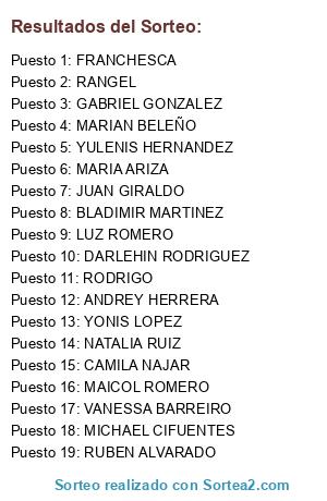 Lista de participantes: DARLEHIN RODRIGUEZ, YONIS LOPEZ, MAICOL ROMERO, NATALIA RUIZ, RUBEN ALVARADO, YULENIS HERNANDEZ, MARIA ARIZA, FRANCHESCA, CAMILA NAJAR, RODRIGO, RANGEL, MARIAN BELEÑO, ANDREY HERRERA, JUAN GIRALDO, BLADIMIR MARTINEZ, LUZ ROMERO, GABRIEL GONZALEZ, MICHAEL CIFUENTES, VANESSA BARREIRO.