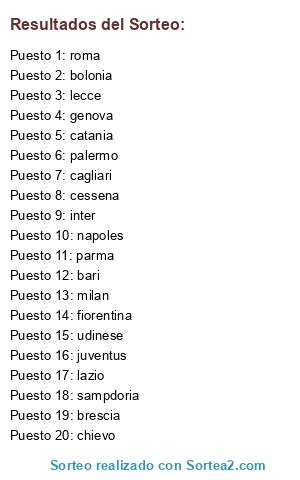 Lista de participantes: lazio, fiorentina, bolonia, inter, genova, catania, palermo, lecce, parma, cagliari, bari, napoles, chievo, sampdoria, brescia, milan, roma, cessena, juventus, udinese.