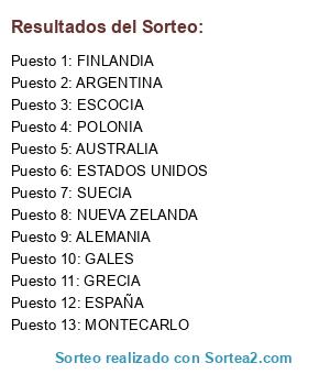 Lista de participantes: AUSTRALIA, ESPAÑA, POLONIA, NUEVA ZELANDA, ARGENTINA, ESTADOS UNIDOS, ALEMANIA, MONTECARLO, SUECIA, GALES, GRECIA, FINLANDIA, ESCOCIA.