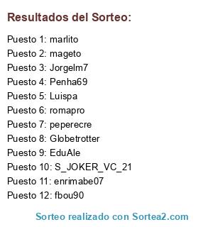 Lista de participantes: marlito, Penha69, Jorgelm7, S_JOKER_VC_21, romapro, peperecre, enrimabe07, EduAle, fbou90, mageto, Globetrotter, Luispa.