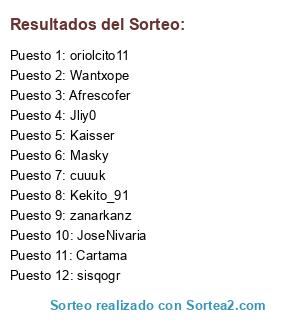 Lista de participantes: cuuuk, oriolcito11, Kekito_91, Kaisser, sisqogr, Afrescofer, Wantxope, Jliy0, zanarkanz, Masky, Cartama, JoseNivaria.