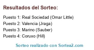 Lista de participantes: Coruxo (Hill), Marino (Sauber), Real Sociedad (Omar Little), Valencia (Jraga).