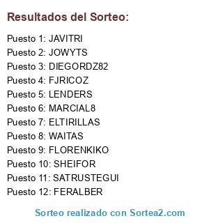Lista de participantes: FLORENKIKO, JOWYTS, LENDERS, JAVITRI, SATRUSTEGUI, DIEGORDZ82, SHEIFOR, MARCIAL8, WAITAS, FJRICOZ, FERALBER, ELTIRILLAS.