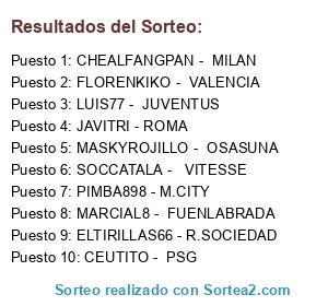 Lista de participantes: CEUTITO - PSG, ELTIRILLAS66 - R.SOCIEDAD, FLORENKIKO - VALENCIA, JAVITRI - ROMA, LUIS77 - JUVENTUS, MASKYROJILLO - OSASUNA, PIMBA898 - M.CITY, SOCCATALA - VITESSE, MARCIAL8 - FUENLABRADA, CHEALFANGPAN - MILAN.