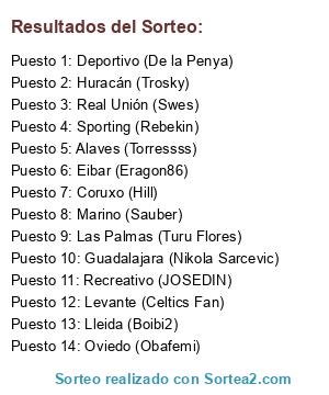 Lista de participantes: Alaves (Torressss), Coruxo (Hill), Deportivo (De la Penya), Eibar (Eragon86), Guadalajara (Nikola Sarcevic), Huracán (Trosky), Levante (Celtics Fan), Lleida (Boibi2), Las Palmas (Turu Flores), Marino (Sauber), Oviedo (Obafemi), Recreativo (JOSEDIN), Real Unión (Swes), Sporting (Rebekin).