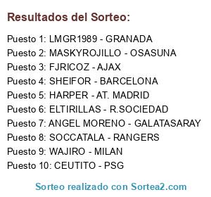 Lista de participantes: FJRICOZ - AJAX, LMGR1989 - GRANADA, MASKYROJILLO - OSASUNA, ELTIRILLAS - R.SOCIEDAD, ANGEL MORENO - GALATASARAY, SOCCATALA - RANGERS, CEUTITO - PSG, HARPER - AT. MADRID, SHEIFOR - BARCELONA, WAJIRO - MILAN.