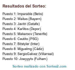 Lista de participantes: Karlitos (Depor), Makaroov (Tenerife), Javitri (Getafe), Miguelmg (Cádiz), Imparable (Betis), Jowyyyts (Fulham), Ceutito (PSG), Bitstyler (Inter), SergioGalvez (Villarreal), Waitas (Bayern).