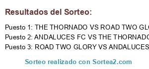 Lista de participantes: ANDALUCES FC VS THE THORNADO, THE THORNADO VS ROAD TWO GLORY, ROAD TWO GLORY VS ANDALUCES FC.