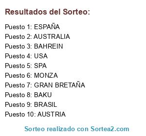 Lista de participantes: AUSTRALIA, BAHREIN, USA, AUSTRIA, BAKU, ESPAÑA, SPA, GRAN BRETAÑA, MONZA, BRASIL.