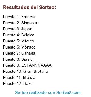 Lista de participantes: Mónaco, México, Japón, Singapur, Baku, Gran Bretaña, ESPAÑÑÑAAAA, Francia, Monza, Canadá, Bélgica, Brasiu.