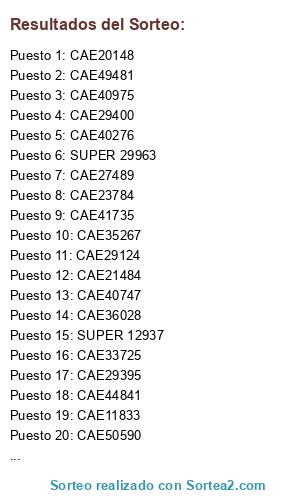 Lista de participantes: CAE11833 (27 participaciones), CAE16963 (2 participaciones), CAE20148 (14 participaciones), CAE21484 (13 participaciones), CAE23784 (21 participaciones), CAE25158 (2 participaciones), CAE27489 (5 participaciones), CAE29119 (5 participaciones), CAE29124 (13 participaciones), CAE29394 (2 participaciones), CAE29395 (10 participaciones), CAE29400 (8 participaciones), CAE33725 (20 participaciones), CAE35267 (15 participaciones), CAE36028 (4 participaciones), CAE37120 (12 participaciones), CAE40276 (10 participaciones), CAE40747 (22 participaciones), CAE40975 (24 participaciones), CAE41735 (29 participaciones), CAE44841 (7 participaciones), CAE45195 (21 participaciones), CAE47004 (2 participaciones), CAE47548 (6 participaciones), CAE48062 (9 participaciones), CAE49481 (21 participaciones), CAE49716 , CAE50590 (16 participaciones), JEFE 14394 (8 participaciones), SUPER 12937 (8 participaciones), SUPER 29963 (7 participaciones), SUPER 29963.