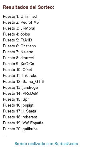 Lista de participantes: 3edu, AlejandroL, ALF2000, anghios, anlausol, Bluelight, bustillo, C0p4, caldesport, Cristianp, danny007, davidcsbn, DIEGOGUTI, dtorreci, duke80, Egiatar, FrA1l3, gufibuba, jandrogb, Javigf, JNV, JRMoral, Kabra, Kiko_Mk6, kkirilov, lamula1, Majestyc14, Miguel20, Morgades, NachoMk1Ca, Najarro, None_002, oblop, OmiBryant24, Oski 68, PacoRu, PedroFM6, perinkel, Petepan, pi_daikin, popigti, RecioGolf4, riderIV, RosaDavid, Samu_GTI6, Scoot, trikitrake, VW España, XaGiCo, xblade, Hector5, nerwin, jfim88, Shack, Spr, Edygtd, albertorfc, I_Saeta, BUSTI1979, mcrsietes, vidale, manolinrr, Justy, PRuDeM, AlbertoMato, rafael bmw, Unlimited, roberest, HugoDiez.