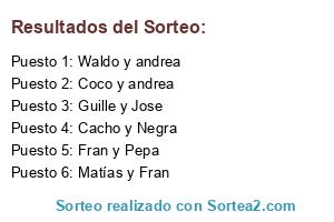 Lista de participantes: Coco y andrea, Waldo y andrea, Matías y Fran, Fran y Pepa, Cacho y Negra, Guille y Jose.