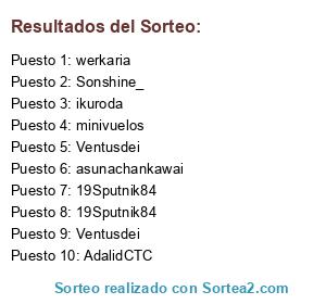 Lista de participantes: 19Sputnik84(3), AdalidCTC(3), alcachofin(3), Ari16____, asunachankawai(3), Bonet65, Copokke, Cordixs, cplhenderson88, Dark_SoulEater, Dragtrop, hermesperez94(2), ikuroda, jaskaos(2), kambril, krun3i(2), kusarami, MandarkTeam(2), manhatan_x(3), Mavi169, minivuelos, Osckis, Ramon_rojas, RealParkos(2), Rion_Jueivra(3), RooxasZetaa, seterissa, Sonshine_(2), TheAero28(3), tuly(2), Ventusdei(3), VeroAbuGamer(3), Wasenk, werkaria, xozit, zakor(2).