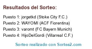 Lista de participantes: HijoDelGordi (Villarreal C.F.), jorgetkd (Stoke City F.C.), WAYOMI (ACF Fiorentina), varomt (FC Bayern Munich).