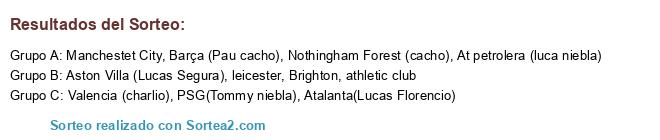 Lista de participantes: Atalanta(Lucas Florencio), Manchestet City, Valencia (charlio), Nothingham Forest (cacho), Barça (Pau cacho), At petrolera (luca niebla), PSG(Tommy niebla), athletic club, leicester, Aston Villa (Lucas Segura), Brighton.