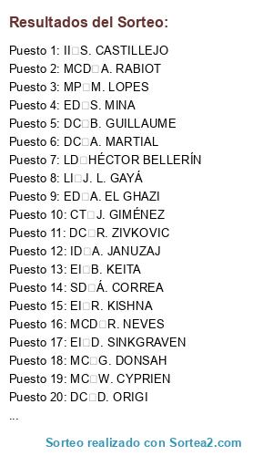 Lista de participantes: LI J. L. GAYÁ, MCD A. RABIOT, DC R. ZIVKOVIC, CT J. GIMÉNEZ, DC TRAORE, EI D. SINKGRAVEN, ED A. EL GHAZI, CT A. ROMAGNOLI, DC D. ORIGI, MC W. CYPRIEN, CT P. MCNAIR, MC T. VILHENA, LI L. SHAW, LD C. CHAMBERS, ID A. JANUZAJ, MC G. DONSAH, LD J-P. GBAMIN, EI B. KEITA, DC B. GUILLAUME, MP M. LOPES, II S. CASTILLEJO, MCD R. NEVES, LD D. CAVARÉ, ED K. N'KOUDOU, LD HÉCTOR BELLERÍN, DC A. MARTIAL, ED S. MINA, EI R. KISHNA, SD Á. CORREA, II K. COMAN.