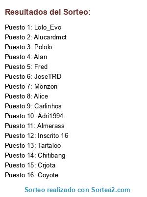 Lista de participantes: Coyote, JoseTRD, Alan, Carlinhos, Adri1994, Crjota, Alucardmct, Inscrito 16, Chitibang, Fred, Lolo_Evo, Almerass, Monzon, Alice , Pololo, Tartaloo.