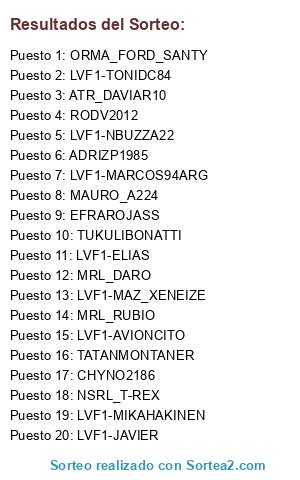 Lista de participantes: LVF1-NBUZZA22, MRL_DARO, ATR_DAVIAR10, TUKULIBONATTI, LVF1-MARCOS94ARG, MAURO_A224, LVF1-JAVIER, EFRAROJASS, LVF1-AVIONCITO, LVF1-MIKAHAKINEN, LVF1-TONIDC84, LVF1-ELIAS, ADRIZP1985, TATANMONTANER, ORMA_FORD_SANTY, LVF1-MAZ_XENEIZE, RODV2012, NSRL_T-REX, CHYNO2186, MRL_RUBIO.