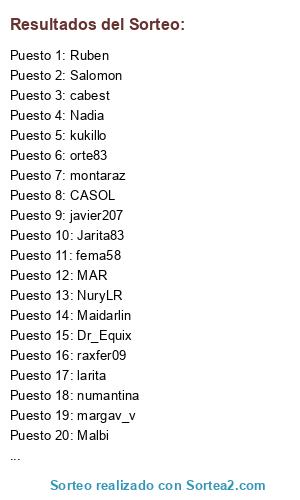 Lista de participantes: rafitamg, Eleniuska, ralopa, Mary, klaukaf, jose, trinty, maquiquema, Nadia, vrony, aisa, judio, palacio8, raxfer09, rociolr, campoviejo, ruas, Agueda, susper76, orte83, Malbi, Linlozano, roditru, montaraz, casiopea1960, isatomy, ediguardo, Law, NURI, Mamen, Estrella, fema58, MAR, feavil, CASOL, margav_v, frailevic, edulis, rober_szr, Dr_Equix, numantina, Almenciba, NuryLR, arcabuz, Zatu, sorian64, mautiko, GR1975, Laura5, juanma, velasco, MONICA, Vicha, cabest, tanita, chas, NUCLEO, Salomon, Margaritina, gato, luis_lamata, Charly, dagoar, protozoo5, jesus1959, MRA, nalantalasa, Corsaria, javier207, Berti, mariasm, MaikaT, burgosJGT, Rivas59, larita, dulce, santoyo, FFG58, fergar, Maidarlin, anabeljv, pitia, lapoza, kukillo, ama, ruth, dgarces, Ruben, EDSOR, Jarita83, jasover.