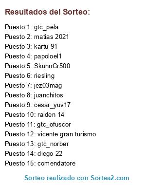 Lista de participantes: gtc_pela, gtc_ofuscor, gtc_norber, comendatore, papoloel1, riesling, vicente gran turismo, diego 22, jez03mag, raiden 14, matias 2021, SkunnCr500, juanchitos, kartu 91, cesar_yuv17.