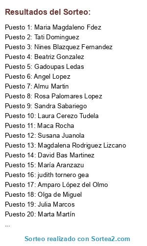Lista de participantes: Jose Manuel Pérez Torres, Magdalena Rodriguez Lizcano, Leonor Molina, Almu Martin, Deivid Kmpa, Maria Magdaleno Fdez, Olga de Miguel, Angel Lopez, Nines Blazquez Fernandez, Nuria Roldán Molina, Conchi Ruiz, Ramon Belmar, Marta Valverde, Lourdes Campayo, María Aranzazu, Gadoupas Ledas, Esther Gutiérrez Espí, Rosa Palomares Lopez, Maca Rocha, Susana Juanola, Pilar Carmona García, Cristina Nombela Moreno, Lola Salvador, Montse Lopez Andres, Magaly VM, Marta Martín, Anabel Nuñez, Helena Mateu Garcia, Mari Garcia Rodriguez, Eva Tarjuelo, Tati Dominguez, Pedro Rivero, Sara Terrén Ortega, Encarni Cindado, judith tornero gea, Ana Rn, Sandra Sabariego, Nuria Garcia Ridao, Isabel Aragües, Elisabeth Gil, Tere Alonso Bejarano, Julia Marcos, Ana Silva, Amparo López del Olmo, Manuela Nyag, Gema Sanchez, Laura Cerezo Tudela, Gema Hernandez, Beatriz Gonzalez, David Bas Martinez.