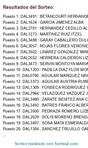 Lista de participantes: DAL0790 AGUILAR MARQUEZ NAYELI, DAL1304 SANCHEZ TRUJILLO GABRIELA, DAL1309 FONSECA RODRIGUEZ OSCAR EDMUNDO, DAL1624 GARCIA JIMENEZ ALBA, DAL1774 DELGADO LOPEZ ITZEL, DAL2331 CONTRERAS MACIAS HARUI YOHUALLI, DAL2552 HERRERA CALDERON LIZVETT SILVIA, DAL2629 SOLIS MORENO BRENDA BERENICE, DAL2701 HERNANDEZ CEDILLO ALICIA MASSIEL, DAL2805 GUZMAN PEREZ LIZETH ANGELICA, DAL2810 TREJO REYES JOSE DE JESUS, DAL2964 VELAZQUEZ VAZQUEZ JUAN PABLO, DAL3017 MARTINEZ MARTINEZ JOSE ANTONIO, DAL3019 MONTOYA FRANCO YESUA, DAL3057 ROJAS FLORES VERONICA, DAL3287 GOMEZ REYES IVONNE, DAL3290 MARTINEZ CHAVEZ CARLA KARINA, DAL3295 HUERTA RIOS SALVADOR, DAL3312 MENDEZ TORRES DANIELA, DAL3373 AGUILAR AUSTRIA RUBEN, DAL3376 SEGURA HERNANDEZ DULCE SOCORRO, DAL3396 MEZA LOPEZ SERGIO FABIAN, DAL3407 SOSA MATA ESMERALDA BERENICE, DAL3439 RIOS OLMEDO EDUARDO, DAL3473 SERVIN MONTOYA MARIANA FERNANDA, DAL3480 ZARATE BENITEZ ANA CRISTINA, DAL3488 GARAY CABALLERO DULCE SAHRAY, DAL3490 LOPEZ REYES VARELA MARIA FERNANDA, DAL3491 BETANCOURT HERNANDEZ CLAUDIA BERENICE, DAL3492 BATRES FRANCO ALBERTO, DAL3493 CERVANTES DE LA CRUZ ALDO ALEJANDRO, DAL3499 URBINA MEJIA NANCY MAGALY, DAL3500 PEDRAZA ROMERO LIZBET, DAL3502 LINAREZ GONZALEZ MIRIAM, DAL3503 ROJO SALAZAR JHERSON IVAN, DAL3504 LARA CRISTIANI MONCERRAT, DAL3506 AGUILAR NAVARRETE INGRID MELISSA, DAL1203 PADILLA DIAZ FLOR MONSSERRAT, DAL1273 MARTINEZ RUIZ ITZEL, DAL1375 SANCHEZ SILOS BRANDON, DAL1418 CARDENAS FIGUEROA CARLOS ALBERTO, DAL1657 MENDOZA MARTINEZ MANUEL.