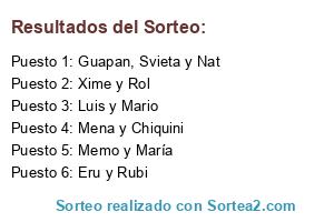 Lista de participantes: Luis y Mario, Mena y Chiquini, Guapan, Svieta y Nat, Xime y Rol, Eru y Rubi, Memo y María.