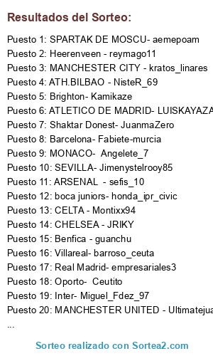 Lista de participantes: CHELSEA - JRIKY, MANCHESTER CITY - kratos_linares, CELTA - Montixx94, SPARTAK DE MOSCU- aemepoam, NAPOLES - DJ__Luian, MANCHESTER UNITED - Ultimatejuanma, ATH.BILBAO - NisteR_69, MILAN - rubenss81, MALAGA- topotencia, BORUSSIA DORTMUND- Calvotainas, ATLETICO DE MADRID- LUISKAYAZA FALTA, PSG- Julio_RD7, VAELNCIA - lalillo46, ROMA- D_labarbacoa7_, ARSENAL - sefis_10, Benfica - guanchu, Villareal- barroso_ceuta, Brighton- Kamikaze, Heerenveen - reymago11, Oporto- Ceutito, boca juniors- honda_ipr_civic, SEVILLA- Jimenystelrooy85, Barcelona- Fabiete-murcia, Inter- Miguel_Fdez_97, Shaktar Donest- JuanmaZero, Real Madrid- empresariales3, MONACO- Angelete_7, Liverpool- malagueo.