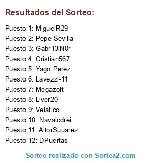 Lista de participantes: Megazoft, MiguelR29, Velatico, Cristian567, Lavezzi-11, Dpuertas, AitorSuuarez, Liver20, Navalcdrei, Gabr13lN0r.