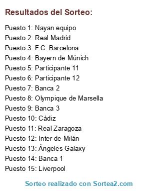 Lista de participantes: Ángeles Galaxy, Olympique de Marsella, Real Zaragoza, Bayern de Múnich, Cádiz, Real Madrid, Nayan equipo, Liverpool, F.C. Barcelona, Inter de Milán, Participante 11, Participante 12, Banca 1, Banca 2, Banca 3.
