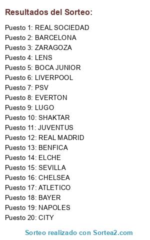 Lista de participantes: PSV, NAPOLES, CITY, ATLETICO, BAYER, EVERTON, REAL SOCIEDAD, REAL MADRID, SHAKTAR, ZARAGOZA, BOCA JUNIOR, BENFICA, ELCHE, JUVENTUS, SEVILLA, BARCELONA, LENS, CHELSEA, LIVERPOOL, LUGO.