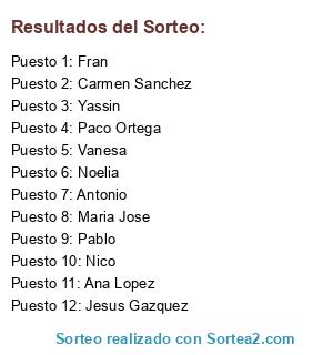 Lista de participantes: Ana Lopez (9 participaciones), Antonio(9 participaciones), Carmen Sanchez(9 participaciones), Fran(9 participaciones), Jesus Gazquez(9 participaciones), Maria Jose(9 participaciones), Nico(9 participaciones), Noelia(9 participaciones), Pablo(9 participaciones), Paco Ortega(9 participaciones), Vanesa(9 participaciones), Yassin(9 participaciones).
