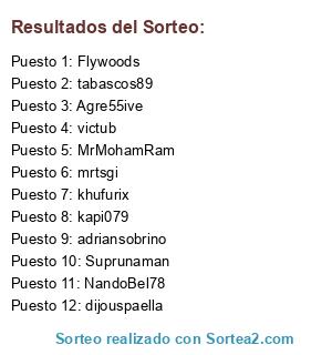 Lista de participantes: mrtsgi, Agre55ive, NandoBel78, victub, Flywoods, MrMohamRam, Suprunaman, kapi079, khufurix, tabascos89, dijouspaella, adriansobrino.