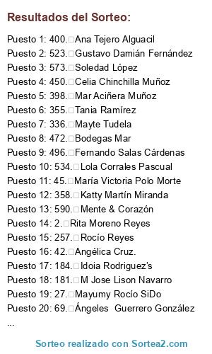 Lista de participantes: 1. Toñi Gazquez Molina, 2. Rita Moreno Reyes, 3. Pili Arroyo Lara, 4. Loretica Loretica, 5. Rosario Moro, 6. Inma Déniz Tru, 7. Sarita Pérez Bellido, 8. May Costa Abellán, 9. Ana Álvarez Nuevo, 10. Nagore Hernica del Puerto, 11. Susana Carvajal Sánchez, 12. Sarita Pereiro, 13. Cristina Medina, 14. Luz Marina Santana Sosa, 15. Conchy Dodero Gpg, 16. Lore Arencibia, 17. Cositas Torrente, 18. Paula Martín, 19. Cristina Pérez, 20. Joaquin Rocio, 21. Natalia Silva, 22. Laurithaa Otero , 23. Jabones Artesanales Acariciarte , 24. Jabones Amparo Parej , 25. Gloria Zarco Villaescua , 26. Betania Rodriguez , 27. Mayumy Rocío SiDo , 28. Jordi Cols Guitart , 29. Chic To Chic Bisuteria , 30. Inmaculada Fernández Campos , 31. Susy Acosta Vega , 32. Rosa Bermúdez Casas , 33. Ángela Villarejo , 34. Noelia Romero Hernández , 35. Paloma Silanes Flor , 36. Gloria de la Cruz , 37. Encarni Gálvez , 38. Claudia Martínez , 39. María Garrido , 40. Ramírez Karÿs , 41. Flory Érase Una Vez Ela , 42. Angélica Cruz., 43. Silvia Monreal García , 44. Cecilia Rivas Espinoza, 45. María Victoria Polo Morte , 46. Klara Miliktrisa Kirbitievna , 47. Idoia Ontiveros , 48. Carla Goytia , 49. Valles Barcelona Duster , 50. Julia Pérez , 51. Hiper Textil Alcosto, 52. Lucía Hernández Carvajal , 53. Vane Gil González , 54. Lourdes Arbiol García., 55. Vanesa Pérez, 56. Patry Espinosa, 57. Laura Benítez, 58. Laura Constanza Álvarez Watanabe, 59. Karen Gálvez Sedelmayer, 60. Manuel Rodríguez Jorge, 61. Josefina Rodríguez , 62. Ana Martínez Álvarez , 63. Nacho Salvador , 64. Ca Vapa , 65. Montse Colmenar , 66. Laia Sanz, 67. Rocío Rivas Viveros, 68. Alicia Cayuela Egidos, 69. Ángeles Guerrero González, 70. Eva María Montero Mercado , 71. Mariajo Riquelme, 72. Mary Cruz Cañadas Fernández, 73. Salud María Valle Pozo, 74. Rosi Andrés, 75. Lorena Díaz Pérez, 76. Faniky Ru, 77. Carmen Ferrero Rocher , 78. Tudorita Cimpoesu , 79. Regina Fernandez Gracia , 80. Susana Pérez Pérez , 81. Antonia Pérez Zambrano , 82. Vanessa Campos, 83. Lorena Mil Detalles, 84. Mónica Pérez Robles , 85. Lorenza Carvajal , 86. Encarni Toledo , 87. María De Los Ángeles Fernández Carmona , 88. Mary Expósito , 89. Sabrina Marín , 90. Wanda Avilés Gallosa, 91. Jose Antonio Mo , 92. Gema Martínez , 93. Verónica Pedraza Lara, 94. Alfredo Pintado , 95. Estifany Alonso Rodríguez , 96. Beatriz Suarez , 97. Zule Hrn , 98. Camelia Omrani , 99. Ndvg Valdemoro , 100. Kelly Alexandra Martin Giraldo , 101. Beatriz Peña Pulido , 102. MCarmen Cosano García , 103. Vestidor De Bea Rosa , 104. La Reina del Sur , 105. Fina Hernández Zamora , 106. Any Flores, 107. Sandra Cantos Rodríguez , 108. María Garrigues Walker , 109. Alicia García Morales , 110. Laura Guardiola Gasca , 111. Sandra Faggioli Checa, 112. Maria Esperanteaguiar , 113. Yo Misma María , 114. Eleanni Rodríguez de Zamora , 115. Jabones Clauddett , 116. Clelia Vasquez Puerta , 117. Yolanda de Andrés , 118. Goyo Ortiz , 119. Mari Valero , 120. Mamen Manzanedo , 121. Ludmila Rivero , 122. Sandra Guzman Capella , 123. Sofía Pérez , 124. Kika Herraiz, 125. Fer Calisto del Rio , 126. Italia Fellini , 127. Estefanía Álvarez Fernández, 128. Anabel López, 129. Marga Soria , 130. Ana Novella F, 131. Virginia Palacios, 132. Teresa Ramajo , 133. Lorena Hernández Liébana, 134. Víctor Gregorio , 135. Jose Martínez, 136. Noelia Martínez, 137. Sindy García Olcina , 138. Ángela Vieira , 139. María Elena Landazuri H, 140. El jardinero fiel, 141. Tina Martínez, 142. Jabones artesanales (David), 143. Au Rro Rra, 144. Carmen Blanco , 145. Cincha Rabiña Buuh, 146. Amparo Díaz , 147. Eva Izdo, 148. Gema Bascuñán , 149. Bluecat Arqueta , 150. Soledad García Mosteiro , 151. Amanda Martínez López, 152. Susana Menor Merino, 153. Esther Rico Pérez, 154. Loles Ruiz, 155. Amalya Cer, 156. Julio González , 157. LY CALDERON, 158. Yesica Guedes Rada, 159. C Gómez Parra, 160. Rosa Caveira De La Calunga, 161. Luc Gstalder, 162. Kate Morales, 163. Gloria Ravina Beltrami, 164. Mangeles García, 165. Encarna Serrano Lomas, 166. Esencia Natural , 167. Lucía Ferrando De Prado, 168. Gloria Moraleja Alarcón, 169. Lydia Vega, 170. Rosa Gancedo Sandes , 171. Fina Moreno Cano, 172. Lorena Suarez Lamata , 173. Javier Conde , 174. Mariela Álvarez, 175. Juana Palmes, 176. Monika Vergara, 177. Ana Lorenzo Sánchez, 178. Dolce Marino, 179. Estela Olmedo, 180. Carmen Prieto, 181. M Jose Lison Navarro, 182. Marisol Llorente Sánchez, 183. Isabel Palacios, 184. Idoia Rodriguez’s, 185. AL Leire Al, 186. Esther Ayala Gómez, 187. Asm Rivas, 188. Daniel Gutierrez, 189. Cristy Sab Ap, 190. Alicia Marcen Altarriba, 191. Sofía Jiménez, 192. Nahla Zaidi, 193. Candela Chata, 194. Carmen Pérez Rodríguez, 195. Sandrait Ter, 196. Gloria Carrasco, 197. Rosa Ortiz, 198. Marisa Lorente Gabasa , 199. Saraluz Gómez Díaz , 200. Zuleyca Bolaños Hernández, 201. Chary Giles Aldana, 202. Susana Santamaría Camino, 203. Pilar Fernández, 204. María Antonia Cid Rodríguez, 205. Cari Lorente Ruiz, 206. Antonio Escalona Espino, 207. Thais Vilar Farias, 208. Mónica García Villarreal, 209. Virginia Saldaña García, 210. Moni de la Concepción, 211. María Rosario France Valdés, 212. Julián García López, 213. Gema Honrubia, 214. Julio Yáñez Sanz, 215. Belén Palomares, 216. Alejandro Yurre, 217. Encar Guiller, 218. Tania Martínez Díaz, 219. Alejandra Torrecilla Domínguez, 220. Katy Simón Benítez, 221. Ainhoa Medina, 222. Clara Guerrero Barroso, 223. Alicia Sánchez Alagón, 224. Sandra Sanz Seris, 225. Lucía Fajardo Aguilera, 226. Magdalena Cuevas Rueda, 227. Soraya Pruaño Peinado, 228. Ángeles Calle, 229. Celia Rojas Portilla, 230. Jessica Escribá, 231. Emiliya Nikolaeva Dimitrova, 232. Rocío Moreno, 233. Patricia García Santolino, 234. Rosi Busto Zapico, 235. María Isabel Torres, 236. María Gutiérrez Teruel, 237. José Luis Martín Núñez, 238. 