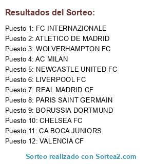 Lista de participantes: AC MILAN, NEWCASTLE UNITED FC, CA BOCA JUNIORS, FC INTERNAZIONALE, CHELSEA FC, PARIS SAINT GERMAIN, WOLVERHAMPTON FC, LIVERPOOL FC, REAL MADRID CF, BORUSSIA DORTMUND, ATLETICO DE MADRID, VALENCIA CF.