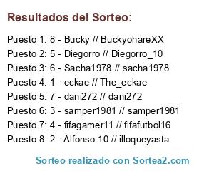 Lista de participantes: 1 - eckae // The_eckae, 2 - Alfonso 10 // illoqueyasta, 3 - samper1981 // samper1981, 4 - fifagamer11 // fifafutbol16, 5 - Diegorro // Diegorro_10, 6 - Sacha1978 // sacha1978, 7 - dani272 // dani272, 8 - Bucky // BuckyohareXX.