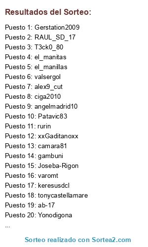 Lista de participantes: ab-17, dpa10, valsergol, franciske, tavins2000, haitower, sephirot, camara81, sarpo, angelmadrid10, T3ck0_80, Patavic83, hardtechno_bpm, ciga2010, RAUL_SD_17, el_manillas, el_manitas, tonycastellamare, x-xXADRI21Xx-x, alex9_cut, keresusdcl, gambuni, Gerstation2009, Conguete, Joseba-Rigon, cris21linero, isma_cr, rurin, Yonodigona, varomt, xxGaditanoxx, Borjaoli.