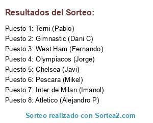 Lista de participantes: Pescara (Mikel), Gimnastic (Dani C), Chelsea (Javi), Terni (Pablo), Olympiacos (Jorge), West Ham (Fernando), Atletico (Alejandro P), Inter de Milan (Imanol).