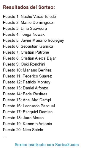 Lista de participantes: Nacho Varas Toledo, Oski Ronchini, Juan Moran, Kenneth Antonio, Raul Iocca, Maxi Udovich, Cristian Alexis Bajar, Arma Cecreta, Sol la Braba, Mariano Benitez, Sebastian Garnica, Patricio Montoy, Mariio Domiinguez, Fede Resines, Daniel Alfonzo, Ezequiel Damian, Jonas Tredici, Ariel Akd Campi, Javier Mariano Irouleguy, Leonardo Pascual, Fernando Gomez, Francisco Concha Molina, Tonga Nowak, Luciano Scaravilli, Alany Pame, Ivan Nuñez, Ema Saavedra, Pablo Reguera, Nico Sotelo, Cristian Patrone, Dani Finke, Federico Suarez.