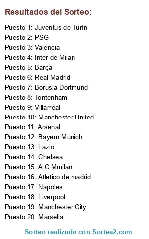 Lista de participantes: Real Madrid, Barça, Chelsea, Valencia, Manchester City, Bayern Munich, Manchester United, Inter de Milan, A.C.Mmilan, Tontenham, Atletico de madrid, Liverpool, Arsenal, Juventus de Turín, Villarreal, Napoles, Marsella, Borusia Dortmund, Lazio, PSG.
