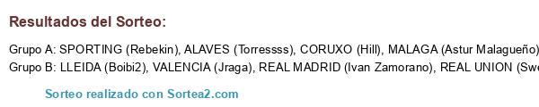 Lista de participantes: CORUXO (Hill), SPORTING (Rebekin), REAL UNION (Swes), LLEIDA (Boibi2), MALAGA (Astur Malagueño), REAL MADRID (Ivan Zamorano), VALENCIA (Jraga), ALAVES (Torressss).