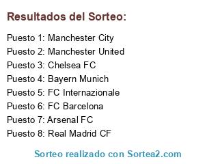 Lista de participantes: Real Madrid CF, FC Barcelona, FC Internazionale, Chelsea FC, Manchester City, Manchester United, Bayern Munich, Arsenal FC.