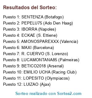 Lista de participantes: PEPELU75 (Ado Den Haag), AMONOSPAREXXX (Valencia), LOPESITO (Olympiacos), R. CUERVO (S. Lorenzo), SENTENZA (Botafogo), MAXI (Barcelona), EMILIO UCHA (Racing Club), BETICO2018 (Arsenal), LUCAMONTANA85 (Palmeiras), IBORRA (Napoles), ECKAE (S. Ettiene), LUIZAO (Ajax).