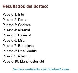 Lista de participantes: Barcelona, Real Madrid, Inter, Milan, Roma, Chelsea, Manchester utd, Atletico, Arsenal, Bayer M.