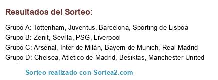 Lista de participantes: Chelsea, Tottenham, Manchester United, Zenit, Arsenal, Atletico de Madrid, Barcelona, Sevilla, Bayern de Munich, Real Madrid, PSG, Juventus, Besiktas, Liverpool, Sporting de Lisboa, Inter de Milán.