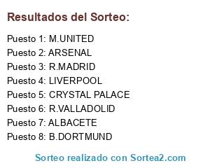 Lista de participantes: M.UNITED, ARSENAL, ALBACETE, R.VALLADOLID, CRYSTAL PALACE, R.MADRID, B.DORTMUND, LIVERPOOL.